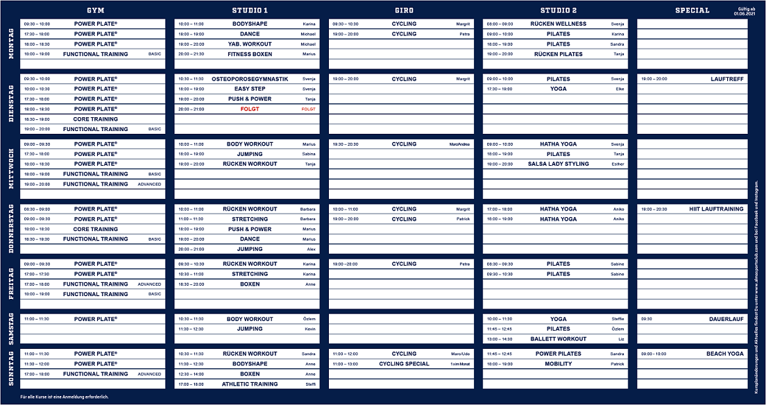 Hier findet Ihr alle Kurse der KW 22! Immer montags bis freitags um 9:00 und um 19:00 sowie samstags und sonntags jeweils um 11:00!